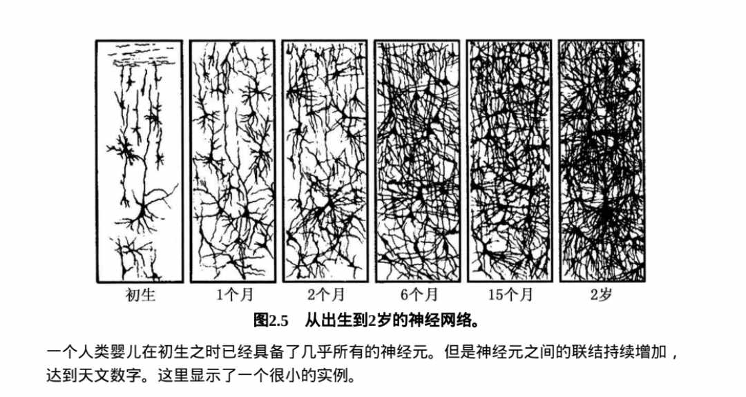 在人出生之时,并不是所有的突触联结都已发育完全,也不是所有的神经元都已髓鞘化(图 2.5),然而,不会再有新的神经元生成了。换言之,你出生带有的神经元就是你终生可用的(并且随着自然老化或损伤,你也会失去其中一部分)。有人可能假设那样的话我们应该有能力生成新的树突来在神经元之间建立更多联结。实际上,这种可能也仅限于大约 2 岁前。因此,在成年人身上,突触的数目不再增加,此时每个细胞体和树突通常能够与大约 1000 个其他神经元建立突触联系,而每条轴突通常也能够与 1000 个其他神经元建立突触联系。