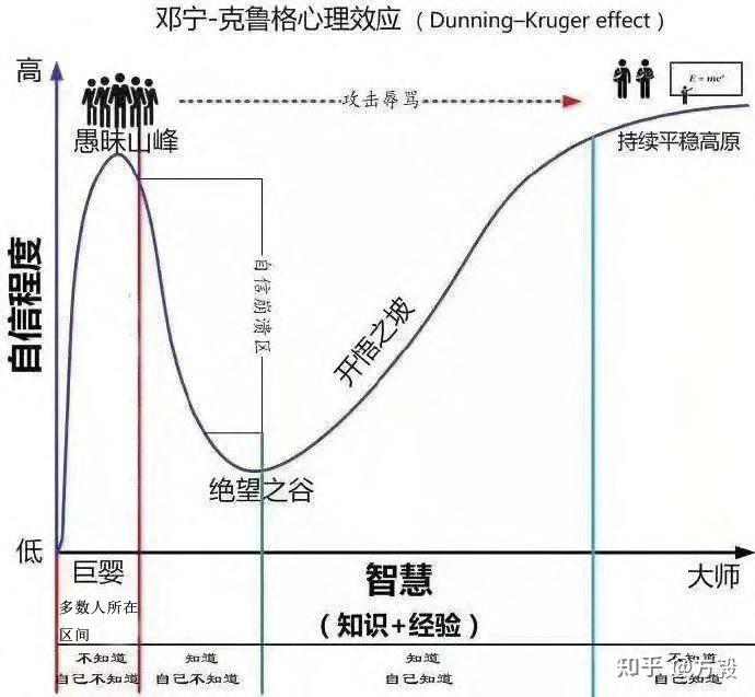 这句话最后还有几个字:“我在高考的时候一点都不紧张,这可能是因为信息茧房的正向作用,或者达克效应的分形”。网上流传着一张关于 “达克效应” 的误解图,横轴是人知道的信息量,纵轴是人的绝望或希望程度,当人知道的信息较少时,随着信息量的逐渐增加,人的希望也会逐渐增加,直到达到一个所谓 “愚昧之峰” 的顶点,在此之后曲线会极速地下降到 “绝望之谷”,再缓慢地爬升到 “开悟之坡”。